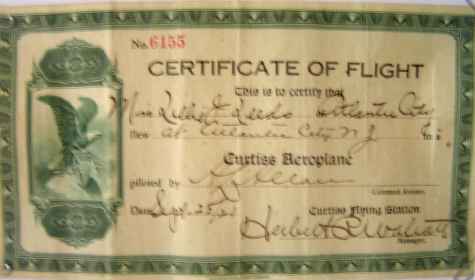 September 25, 1921 Collection of Edith C. Ralon, 2-14-11 Are you are still looking at Flight Certificates from Curtiss Flying Station, Atlantic City? My mother Lillie J. Leeds and fellow workers in a law firm, Atlantic City, were offered free flights if they would show up at the air field. Mother's certificate is # 6155 and dated September 25, 1921. She often said she was a schill to entice others to take paid flights over Atlantic City. I still have the certificate signed by aviator A. L. Allan and manager Herbert R or P Walrath. Mother was a single lady of twenty-eight at the time, two years before she married my father. Mother lived til 1983 and traveled by plane from Maryland to Florida and back for ten years winters. Her last trip was 1974. My father did not want to fly, so he traveled by Greyhound bus all those winters, until his last trip was by plane. Edith C. Ralon |