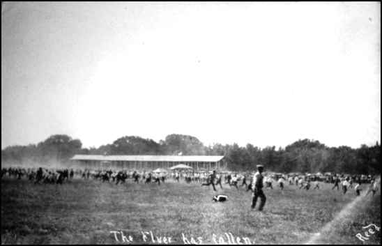 Closed An Otherwise Re- markably Successful Fair NORTON COURIER by Fred M. Duvall, Publisher Thursday, September 7, 1911 Our information is that the particular machine sent to Norton was Curtiss's own private machine, and what he called a Hydroaeroplane. It was differently built for the regular aeroplane in that it had pontoons attached for the purpose of using it to settle upon and rise from a body of water. The pontoons were removed before sending to to Norton, but apparently not rebalanced. Mr Frisbee started from the west end of the grounds, rising nicely into the air to the height of about 40 feet, when the machine suddenly dropped to the earth like so much stone. The aviator was uninjured, but not the machine. Certain parts of it were badly broken, bent and twisted. This ended the attempt at flying for that day. Mechanics of the company, and all hands at the garage were put to work on repairing. New pieces were put on from repairs carried, and an attempt to balance up the machine by taking off certain parts and moving the engine forward. About four o'clock Friday afternoon, the machine was pushed out into the parkway inside the track and run down to the northeast part next to the track. There the engine was tried out a couple of times, but no start made. It was said the wind was unfavorable, but our best judgment for that is that Mr. Frisbee had grave doubts of the machine acting right. He was not satisfied that the exact balance of the parts needed for a successful flight existed. It was getting late, the races were over and the people were getting uneasy. One by one, two by two, and directly in bunches, men came down to where the machine was until two hundred people had grouped about the machine. This crowd was given to understand that the conditions were unfavorable and exceedingly dangerous to attempt a flight. Nevertheless, the crowd, or a portion of it, became insistent, jeering at and taunting the aviator. This was kept up until the man became almost frantic, and with the sound of coward, and other abusive epithets ringing in his ears, and contrary to his own and the managers judgement, he jumped into the seat and bidding his goodbye, he sent the machine out into the field, where in about 200 ft it rose into the air. |