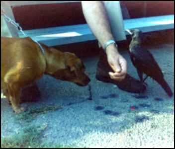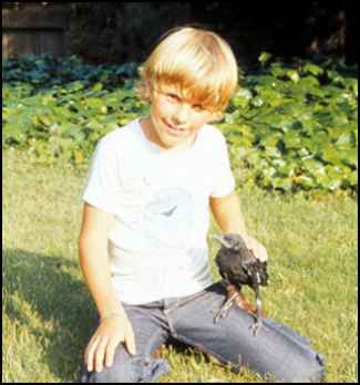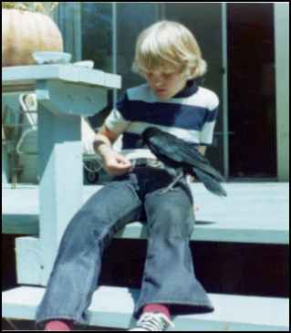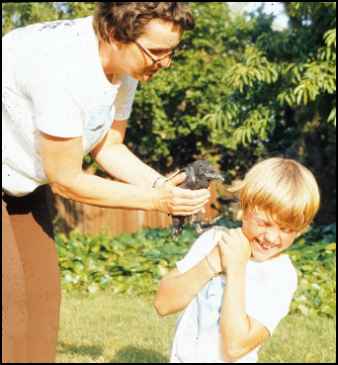 Every time he fed him, Stephen would say, "Hello Fred, hello Fred."Fred soon learned to call "caw, caw," loudly. Father brought home a turkey cage and tied some branches in a criss-cross so that Fred could learn to walk on branches. Stephen fixed a flowerpot saucer with Kleenex and put it in one corner of the cage for a nest. Stephen loved to have Fred climb on him. Sometimes the bird would try to pull threads out of his red jeans or tug at his blond hair. Fred loved to be taken outside for exercise, but he always hated to be brought back into the house. One Saturday morning Stephen ran into the bedroom and woke his mother up with, "He flew! He really can fly. He went all the way from the deck to the peach tree." This was about 15 yards. Sunday Fred flew a little farther, into the olive tree. Wednesday after school, Stephen's teacher came to visit and to see Fred. Stephen had wanted to take him to school. The bird lady warned him this might frighten Fred too much. So some of the children came, a few at a time, to see Fred at home. Mother took Fred out of his cage and as |