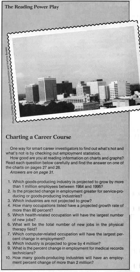 new jobs than any other sector. The Department of Labor also looks for substantial increase in jobs in health services, engineering, legal, social, and accounting services. Because elementary school enrollments are increasing, employment of elementary school teachers is expected to grow rapidly. Employment in most health occupations will grow as the population grows----especially as the number of older people increases. Registered nurses and nursing aides and orderlies will be in far greater demand. Physicians, dentists, and veterinarians, however, may expect unprecedented competition due to the large number of newly trained practitioners entering those fields every year. Beth Kaima, an academic counselor at Pasadena City College, says, "I'm more worried about whether they (students) can spell and read and write, than what courses they should take to train them for a job in the future. Today you see people jump form one career to another....Once you learn to think and solve problems, you're more apt to be able to adapt when your job changes." |
