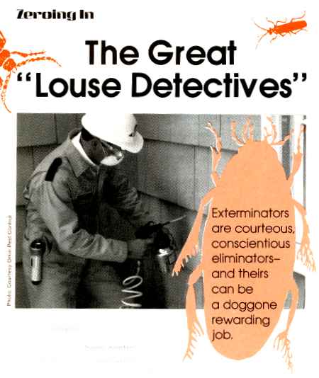 controllers just out of high school earn starting salaries of about $175 to $200 a week, depending on geographic location. To qualify for the job, applicants must be at least 18 years old, in good health, and free of ailments such as asthma, bronchiitis, and back trouble. They have to be able to bend, kneel, crouch, and crawl. And they have to be friendly, tactful, well-groomed, responsible, and , of course, very careful The Ins and Outs, Upsides and Downsides Most of the work is clean, but sometimes it is necessary to crawl into dirty or dusty places to treat hard-to-reach spots. The work is both outdoors and indoors. Says Art Gibbs: "It's about 50/50. Especially if I go for fleas. I normally treat both in and outside." As a rule, pest controllers work eight hours a day, 40 hours a week. Sometimes the |