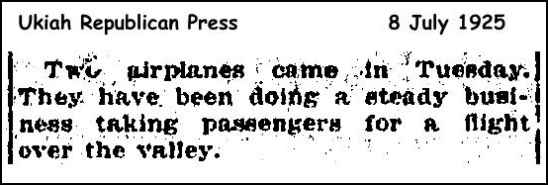 Contributed by Marc Ruegamer, 6-30-10 Thanks for all the great info. It seems like all the guesses on the date are around the same time. I had a volunteer researcher in Ukiah find a news clipping about 2 planes coming in on the 4th of July that were giving rides. It was dated July 8, 1925. The possible owner, William Shonts, lived from 1896-1981 and died in Michigan. His age would've been about right for a WW 1 pilot or barnstormer. |