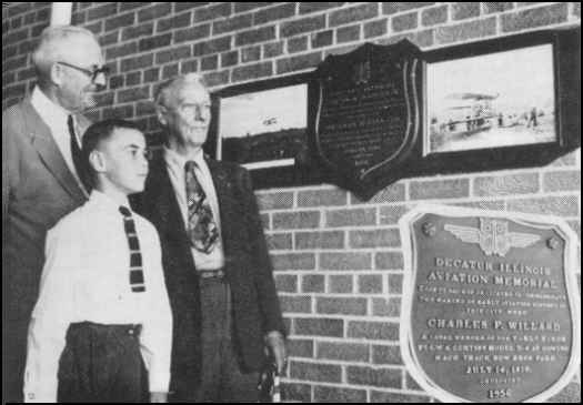 Decatur Park Board and airport officials. Mr. Hodge's grandson unveiled the plaque. Introduced at the afternoon dedication ceremonies by Dr. R. Zink Sanders of the Park Board, Early Birds President David H. Young described the EB organization and its membership and paid special tribute to Charles F. Willard, recalling Willard's early day pioneering accomplishments and experiences. In those days, he pointed out, very few persons had any knowledge of flying, and those who risked their lives in the air were impelled by a spitit of adventure as well as a vision of the possibilities of flight. Young likewise paid high tribute to the city fathers of Decatur for their foresight in building a fine, modern airport which comes under the management of City Parks with Lacy Chandler as the airport manager. |