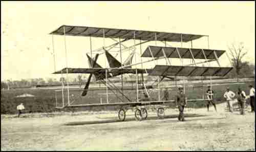 working something like the laths of a Venetian blind, and on side planes forming normally the extreme panels of the main surfaces, hinged on the front edges; and was to be driven by eight propellers, which were 3 ft. 10 in. in diameter and 4 ft. pitch, and placed in a row in between the main surfaces and well advanced inside of the rear or feathering edges of the surfaces. It took some months to work out the transmission problem of the eight propellers. As in the helicopter, they were driven by a small wire cable. Most of the experts declared that the difficulty of such a complex transmission never could be solved. Mr. Kimball |
