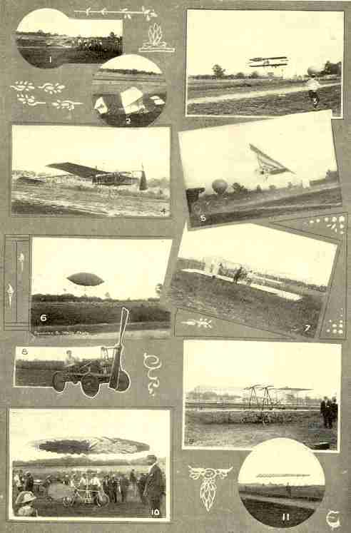 1. Hendrickson Glider. 2. Martin Glider. 3. Glenn H. Curtiss making a straight flight. 4. The Beach- Willard Aeroplane sunning itself. 5. Wm. H. Martin and his glider in a towed flight. An instant after this photograph was taken the glider scaled the fence on the outside of the track. 6. Dr. Wm. Greene making an ascent with the Myers Dirigible. 7. Rear view of the Shneider Biplane. 8. Charles M. Crout driving the Thomas Windwagon. 9. Lindsay's Aeroplane minus the motor. 10. The Rickman Helicopter. 11. Wm. H. Aitken at the start of a towed flight with a Witteman Glider. |