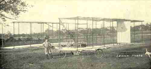 Pincus Brauner and A. J. Smith constructed together a biplane, which proved the second apparatus built at the Park to succeed in making good flights. In general outline, this also somewhat resembled the Society's machine, but had features that were entirely the inventions of the builders, and many of the small construction details were simpler and superior to any- thing that had previously been done. Both Mr. Smith and Mr. Brauner made a number of short flights, and the machine was exhibited at Madison Square Gardens. But eventually Mr. Brauner, in takng a second step in the air to reach a greater height, raised his front control too acutely, and fell backwards, smashing the apparatus almost entirely, but himself escaping unhurt. The results, however, were highly encouraging. Dr. Walden tried out his big tandem apparatus with the Society's motor, and was testing upon it the varying efficiency of a number of propellers. Unfortunately, one night he left the machine out in the open, and a heavy wind storm arising, battered the apparatus into a heap of wreckage before the watchman oculd take any steps to save it. Meanwhile, however, the doctor has two more machines on the way. F. H. Lindsay, unable to find on the market a suitable motor for his midget machine, started to build one for himself. R. E. Ernst constructed an apparatus in which the principle of air compression was to be utilized. The air was drawn into the interior of a sort of cabin by means of fan |