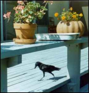 Every time he fed him, Stephen would say, "Hello Fred, hello Fred."Fred soon learned to call "caw, caw," loudly. Father brought home a turkey cage and tied some branches in a criss-cross so that Fred could learn to walk on branches. Stephen fixed a flowerpot saucer with Kleenex and put it in one corner of the cage for a nest. Stephen loved to have Fred climb on him. Sometimes the bird would try to pull threads out of his red jeans or tug at his blond hair. Fred loved to be taken outside for exercise, but he always hated to be brought back into the house. One Saturday morning Stephen ran into the bedroom and woke his mother up with, "He flew! He really can fly. He went all the way from the deck to the peach tree." This was about 15 yards. Sunday Fred flew a little farther, into the olive tree. Wednesday after school, Stephen's teacher came to visit and to see Fred. Stephen had wanted to take him to school. The bird lady warned him this might frighten Fred too much. So some of the children came, a few at a time, to see Fred at home. Mother took Fred out of his cage and as |