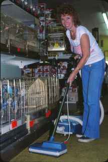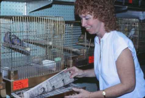 | Barbara McClure vacuums the bird section of her shop twice daily, believing that a clean area will encourage customers to buy birds. |