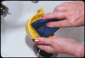 on the floor, they are not as likely to buy." If you have a floor without carpeting, mop it daily with disinfectant. Use clean newspapers for the bottom of the cages. A local pet shop owner said, "I get newspapers from two or three customers who bring them in for me so I know the newspapers haven't been sitting in a garage or been sprayed with anything. A good shortcut is to pre-cut your newspaper, several thicknesses at a time, to the size of each cage. The cages should be cleaned every morning. Be careful when handling the paper not to touch the droppings and carry disease from one cage to another. Wash the water cups well. A two-sided sponge such as the type recommended for Teflon works best for getting into the corners. It is best to have a change of cups and perches so that once a week they can be soaked in bleach water. |