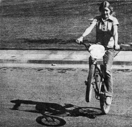 so sore at first. You aren't used to asking them to help support you weight." DeLong's book goes along with this He mentions that "when the classic touring position is used the body is leaning forward at a 45 degree angle, the weight on the saddle is reduced, and friction between the saddle sides and legs is lessened. Leaning the body farther forward reduces air resistance and higher riding speeds and faster leg movement are attained. Saddle friction, developing heat and chafing, combined with the potential for longer trips makes these factors important." He's not kidding. Be sure to take corn starch along for your first long, hot rride to help the chafing. Mrs. Grant Cotter, wife of the President of the Los Angeles Wheelmen, rides a U-32 Troxel saddle which is 2" thick. Grant said, "It made all the difference in the world when I got her to lower the handle bars and bought the new saddle. She has a chipped tail bone and biking used to be just an ordeal for her. Now she looks foward to it. l Labor Day weekend we went 240 miles on the Ventura trip and she loved it." Gals, (and guys, too) it's all in knowing how.l Start out a few miles a day, ride often, remember to lift your butt off the saddle every once in a while. If you can aford it maybe invest in a better saddle. Then you can hightail it down the bikeways with the best of them. |