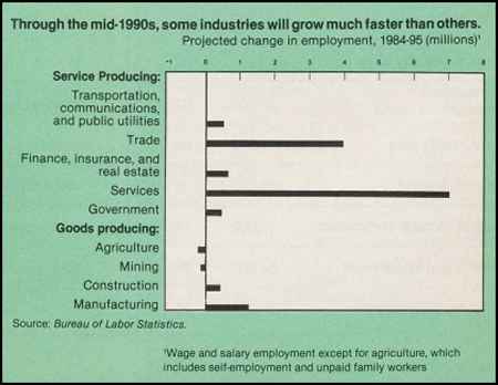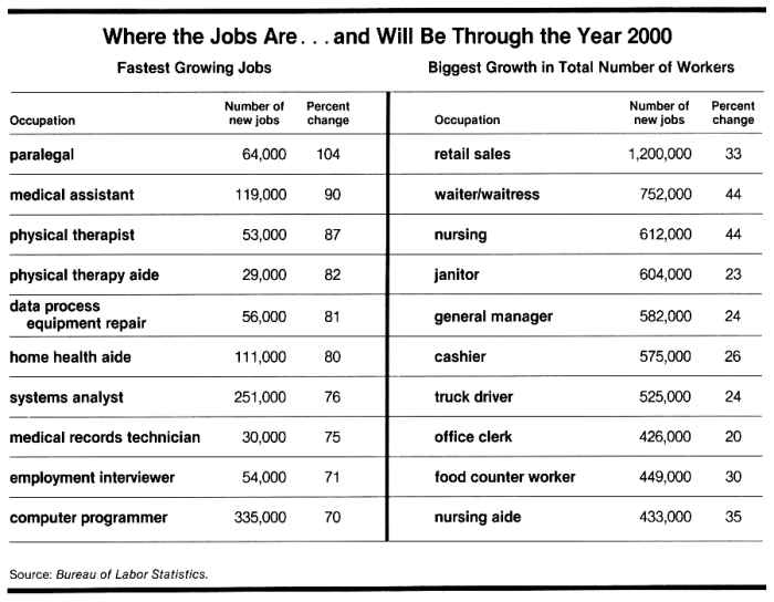 new jobs than any other sector. The Department of Labor also looks for substantial increase in jobs in health services, engineering, legal, social, and accounting services. Because elementary school enrollments are increasing, employment of elementary school teachers is expected to grow rapidly. Employment in most health occupations will grow as the population grows----especially as the number of older people increases. Registered nurses and nursing aides and orderlies will be in far greater demand. Physicians, dentists, and veterinarians, however, may expect unprecedented competition due to the large number of newly trained practitioners entering those fields every year. Beth Kaima, an academic counselor at Pasadena City College, says, "I'm more worried about whether they (students) can spell and read and write, than what courses they should take to train them for a job in the future. Today you see people jump form one career to another....Once you learn to think and solve problems, you're more apt to be able to adapt when your job changes." |