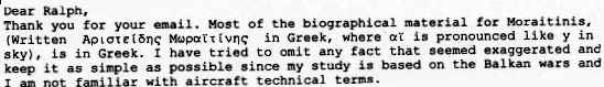 Contributed by Christos Zafiropoulos, 12-18-10 ![]() Aristide Moraitinis(1891-1919) was an officer of the Royal Hellenic Navy. He volunteered to be an aviator and served in the Balkan wars of 1912-1913 as a pilot flying French made Farman. After Greece's entry in the First World War in June 1917 he served in the Macedonian front flying English made Sopwith Camel. His missions were to bomb Bulgarian military targets. He was credited with shooting down nine enemy aircraft. In November 1917 he took part in a mission bombing military targets in Constantinople and for his actions he was honoured by the King of England with a D.S.O. (London Gazette 22/11/1917). In 20/1/1918 he took part in the air raid against the German battleships Goeben and Breslau that were in the Dardanelles. He repulsed an attack by 10 enemy aircraft, shooting down three of them. He barely escaped and his plane was heavily damaged. For this action the British government added a bar to his D.S.O. In the 22nd of December 1919 (O.S.) Moraitinis disappeared as he was flying from Thessaloniki to Athens. (newspaper Embros 18-1-1919). He was declared dead a month later as neither his body nor his airplane were found. |