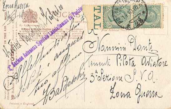 Back of post-card This is a very interesting document because Baldeschi Federico was sending his post-card to Dante Nannini from a war zone and nobody was allowed to send letters from the war zone without the naked eye of the authorizing officer and in fact the officer after reading the text he stamped on the card a bleu stamp granting a certificate that in reality the text was actually written by the person sending the card i.e. by Baldeschi Federico and this obviously for safety purposes. Unfortunately the paper of the postal stamp covered the number indicating the position of the flame-thrower department in the war zone from where F.Baldeschi sent his post card to his friend Nannini Dante a pilot lieutenant flying for the 3° section S.V.A. located in a secret and unknown war zone "Zona Guerra" Italian text: Zona guerra 14 X-18 2° SEZIONE AUTONOMA SPECIALE LANCIAFIAMME DA POSIZIONE ? Spedisce Baldeschi Federico Affettuosi infiniti saluti e auguri tuo affezionatissimo F.Baldeschi Translation: War zone 14 october 1918 2° SPECIAL AUTONOMOUS DEPARTEMENT FLAME-THROWER FROM POSITION ? Forwarder Baldeschi Federico Warm hearted and infinitely healthful wishes and regards yours faithfully F. Baldeschi |