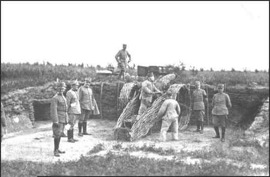 A cannon made of rattans to deceive the enemy aviators. General Cadorna and his General Staff. Nannini anotó al dorso: Un cañon de bejucos para engañar a los aviadores enemigos. El General Cadorna y su estado mayor. |