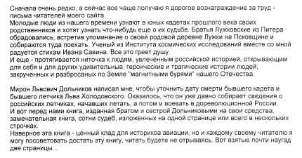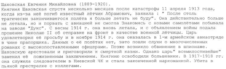 Via email from Dolnikov Miron , 11-17-06 Translation from the Cyrilic courtesy of Bruno de Michelis. Shahovskaja Eugenija Michailovna (daughter of Michael) (1889-1920) A few months after the plane's crash (which happened on the 11th of April 1913), in which the famous aviator Abramovich accidentally died, princess Shahovskaja (feeling responsible for his death) affirmed: " After this tragic event, I'm not going to fly any more" As a fact she did not, but she could not stop to be interested in Aviation. Being introduced to the new planes, she visited the "DUKS" factories. From the spring of 1914 she started again to fly and when the first World War started, she asked His Excellence Nikolai II to be sent to the battle field as an air- force pilot. The Tsar granted her request and in November 1914 she started to serve as a junior officer in the Russian air force. There is not any evidence or reports of her flights, however rumors started about her multiple love affairs with high ranking officers. Later she was accused of being a spy. She was arrested and sentenced to death. But the Tsar showed her (third cousin) mercy and changed her sentence to life imprisonment. In 1917 the Bolsheviks released the (princess). During 1917-1918 she worked in the Kiev's pre-KGB organization and subsequently became a complete drug addict. She was later killed in a drunken shooting amongst colleagues. Yours faithfully, Dolnikov Miron |