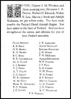 O YOU, Captain L. M. Woolson, and            those assisting you, Hermann I. A.            Dorner, Herbert C. Edwards, Walter            E. Lees, Marvin J. Steele, and Adolph Widman, we pay tribute today. You have made possible the Packard-Diesel Aircraft Engine. You have added to the fame of Packard. And you have strengthened the esteem and affection for you of