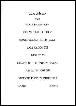 GREEN TURTLE SOUP BONED SQUAB WITH JELLY RICE CROQUETS NEW PEAS GRAPEFRUIT & ENDIVE